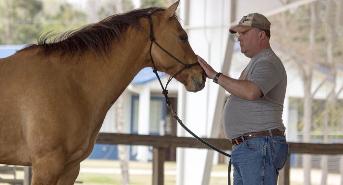 A man in a grey shirt and blue jeans is standing next to a brown horse with a black bridle, petting its face. They are in a fenced area with a wooden fence and a building in the background. | Lander Univ. to Offer Equine Therapy to Veterans with PTSD | d15ce6640ab6e6c736ed34225162386bf9a3776c5987257fe42428e3e5bbd52b | 001229734380 | 0 | 0 | 39 | 10 | 0 | 0 | |