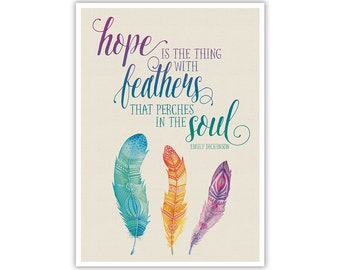 A framed poster with a quote that reads 'Hope is the thing with feathers that perches in the soul.' The quote is in a cursive script and is surrounded by three stylized feathers in shades of blue, yellow, and purple. The poster has a beige background and is mounted on a wall. | Watercolour Feathers and Quote - Instant Digital Download - Large Printable Poster Artwork - Wall Art Nursery Home Office | 60edaf492d0340d8980b9d8b8169f133d0a3c43b21b6408230431cc00bd94486 | 001229734703 | 0 | 0 | 52 | 19 | 0 | 0 | |