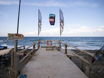 A wooden pier with a rope barrier extends into the ocean, with two large flags flying above. The ocean is calm with gentle waves, and the sky is clear with a few clouds. There are several people on the pier, some standing and others sitting on chairs. A surfboard is propped up against the pier, and there are beach umbrellas and a table set up on the right side of the image. | Kitesurf rentals in Santorini | e11c1e96cc6fc4589047f0093dc8d35c3e0c5de1fec525b3f63183733fead703 | 001229734618 | 0 | 0 | 72 | 4 | 0 | 0 | |