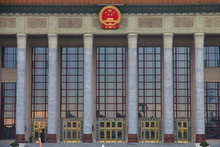 A large building with a prominent red emblem featuring a yellow character on a red background, located above a set of ornate golden doors. The building has a classical design with columns and a large window that reflects the sky. The scene is set during the day with clear skies. | Great Hall Of The People (National People\xe2\x80\x99s Congress) In Beijing, China | 16ddc4c30e094be70a4c6c8a33e784aa117a827c7a99a3bc97573d4dcbf333f4 | 001229735036 | 0 | 0 | 50 | 11 | 0 | 0 | |