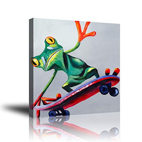 A vibrant painting of a green frog with large, expressive eyes and orange feet, perched on a red skateboard with blue wheels. The frog is depicted in a dynamic pose, with its front legs extended forward and its back legs pushing off the ground. The skateboard is positioned on a reflective surface, suggesting a glossy floor or water. The background is a plain, light color, allowing the frog and skateboard to be the focal point of the image. | Wall decor Premium Canvas Wall Art, Abstract Art for Frog Life Oil Painting Art, Modern Decorative Artwork for Bedroom Home Office Framed Ready to Hang 20x20inch | ae7ec1e8c8e4cd1b982db8f2fde44cc7778dc85b79484bfc36dc008004f5f237 | 001229735012 | 0 | 0 | 78 | 26 | 0 | 0 | |