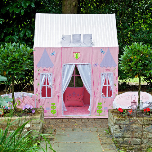 A pink and white playhouse with a pointed roof and a window on each side is set up in a garden. The playhouse has a door with a heart-shaped window and a curtain. There are two pillows inside the playhouse, one pink and one green. The garden has a stone pathway leading to the playhouse, and there are plants and flowers around it. | Princess Castle Play Tent | 2f2e9ee756574bdc7278ee95de078f4b6c86c91ba08941269476a89b1624324d | 001229734957 | 0 | 0 | 63 | 4 | 0 | 0 | |
