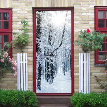 A red door with a frosted glass window pane, showing a snowy winter scene with bare trees and falling snowflakes. The door is flanked by two white window frames, one on each side, and a white radiator is visible to the left of the door. The scene is set against a backdrop of a brick wall with a red flower pot containing a red flower on the right side. | Snowy Forest Pattern Door Stickers - GRAY GRAY | f19dadabf66139a079f79b65e1e4bf9bbca8ea2dff69718a97264b1daf4917d7 | 001229735182 | 0 | 0 | 69 | 8 | 0 | 0 | |