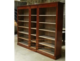 A wooden bookshelf with a dark finish and visible wear and tear, including scratches and faded areas. The bookshelf has three sections with multiple shelves, and the doors are slightly ajar, revealing empty shelves. There is a small black object on the right side of the bookshelf. | Jual Bookcase - Wardrobe - lemari buku - defurnitureindonesia DFRIBnW-7 | 12d38d6c9be61b793cf1ffaa73ba5e4498b017acb27bfd2e7d0df2c981744491 | 001229735167 | 0 | 0 | 47 | 10 | 0 | 0 | |