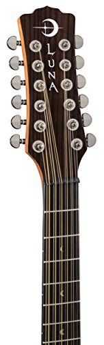 A close-up of a guitar neck with the headstock showing the brand name 'Luna' and the tuning pegs. The fretboard has a dark wood finish with white inlays, and the frets are not visible in this view. | Luna Gypsy Dreadnought 12-String Mahogany Acoustic Guitar, Satin Natural | a3fe96f6e4e8029fb4a1f2d6f41c4aa8d18bb2cd8be83ecb4fedd694973a3c2c | 001229735199 | 0 | 0 | 37 | 9 | 0 | 0 | |