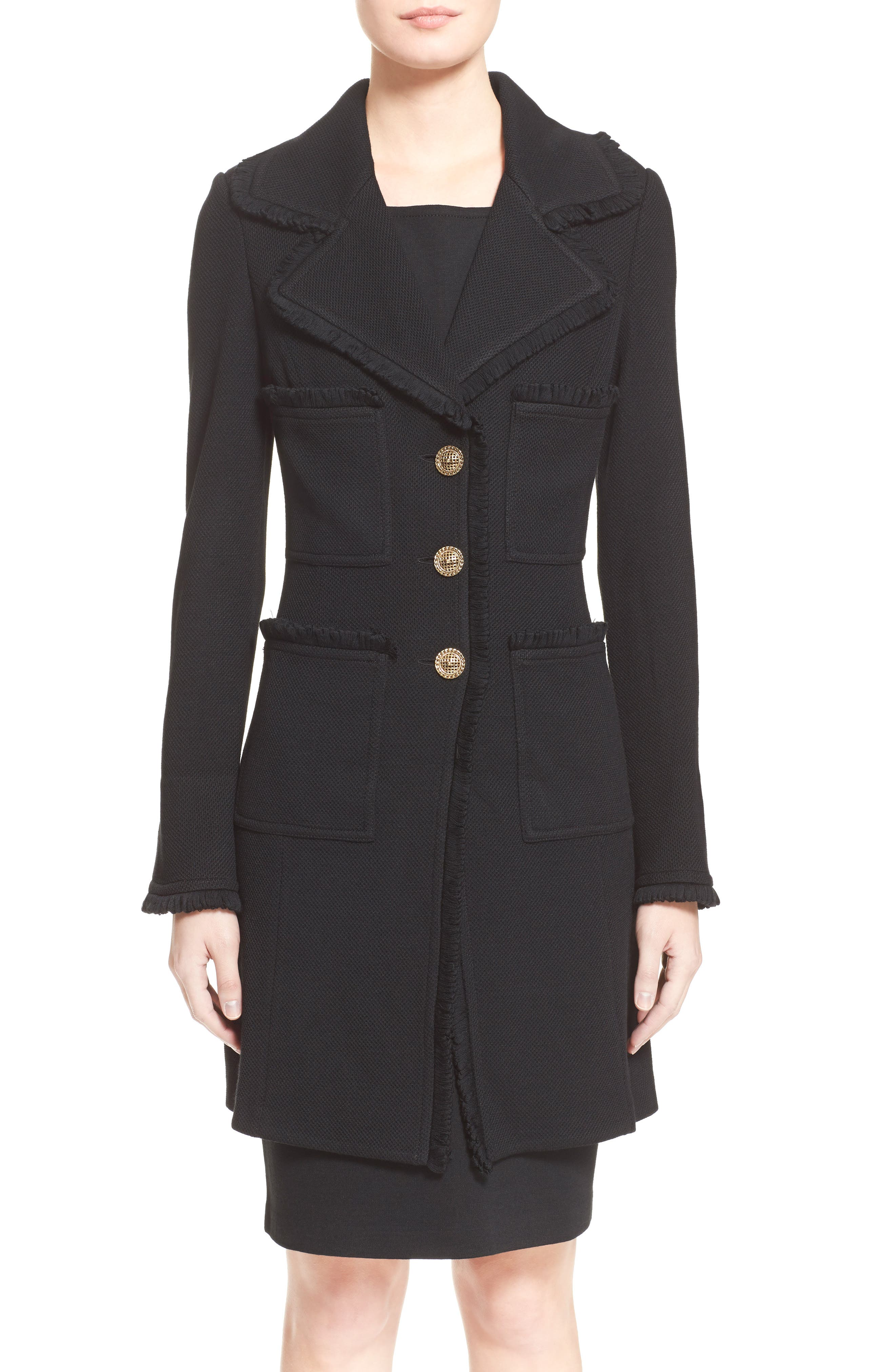 A woman is wearing a black modern business suit with a fitted jacket and a skirt. | ST. JOHN COLLECTION,\n Fringe Trim Milano Piqu\xc3\xa9 Knit Coat,\n Alternate thumbnail 2, color,\n CAVIAR | fa62cbe360b67d55eb2267fcd1d5a28f600262631b14bd360c018cd17032c286 | 001229735210 | 0 | 0 | 16 | 14 | 0 | 0 | |