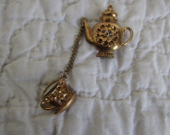 A golden teapot charm with intricate designs and a chain attached to it is lying on a white, textured cloth. | Vintage Brooch Gold Tone Teapot with cup hanging from a chain | 2126eba2750715d67f84aac56809e21f739ec5212cf6460690cd3e3522fd591b | 001229735507 | 0 | 0 | 20 | 11 | 0 | 0 | |