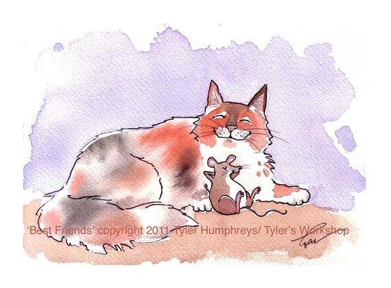 A watercolor painting of a chubby cat with a playful expression, lying down with its mouth open, as if it's about to catch a small mouse that is also depicted in the painting. The cat has a white and brown coat with a pinkish-purple background. The painting is signed 'Best Friends' and 'Tyler Humphreys' in the bottom right corner. | Mouse and Cat Friendship Greeting Card, Funny Pets Watercolor Cat & Mouse Painting Print/ Animals Illustration Cartoon Print 'Best Friends' | 621fd9654495c63f1290bfa12a01aa2171dee52d073c2482b9d299b2a14d221e | 001229735942 | 0 | 0 | 59 | 20 | 0 | 0 | |