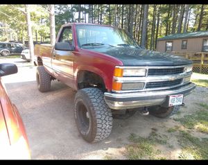 A red pickup truck with a black bed cover is parked on a dirt road. The truck has a large grille with a prominent Chevrolet logo, and the license plate reads 'D-4-2'. The truck is surrounded by a forest with tall trees, and there is a small cabin in the background. | 1989 Chevy Silverado for Sale in Columbus, OH | 4efcf6f1a71eeecc6235cea505005fc2bc0a85b6d8878c0ec245bc9413139d40 | 001229735970 | 0 | 0 | 51 | 8 | 0 | 0 | |