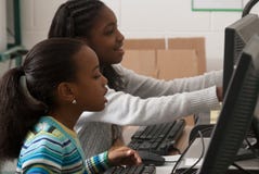 A young girl with braided hair is sitting at a desk with a computer monitor in front of her. She is wearing a striped shirt and is looking at the monitor with a focused expression. Next to her, another young girl with long hair is also looking at the monitor, seemingly engaged in the same activity. Both girls are wearing white sweaters. The room has a whiteboard on the wall, and there are several books and a piece of paper on the desk. | Free Children At A Computer Stock Photography - 11962482 | 26de3018dd3debb4a137c5c960c5eadf2ccf9d43c2957784ba189aa6fc2ba9d4 | 001229736035 | 0 | 0 | 83 | 9 | 0 | 0 | |