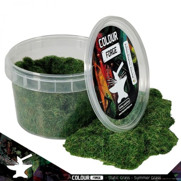 A clear plastic container filled with green artificial grass is placed on a surface with a colorful background. The container has a label on the lid that reads 'COLOR FORCE' with a stylized image of a grassy area and the words 'STATIC GRASS - SUMMER GRASS'. The label also features a barcode and a logo. The artificial grass inside the container appears to be a mix of different shades of green, and there are some clumps of grass scattered around the base of the container on the surface. | The Colour Forge Sand & Flock Static Grass - Summer Grass (275ml) - TCF-BAS-024 - 5060843101819 | 5e918f9e693c67433ad11ead12222bd44850995caa0da8b12d8c79bf78d98913 | 001229735864 | 0 | 0 | 88 | 16 | 0 | 0 | |