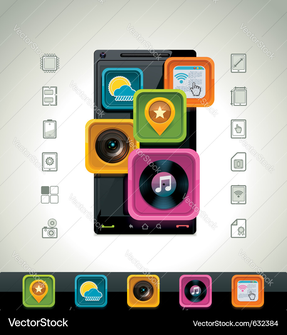 A stylized illustration of a smartphone with various app icons arranged around it. The icons include a camera, music note, map pin, and others. The smartphone is centered in the image, with the icons positioned above and below it. The background is a plain white color. | Smartphone icon vector image | 73f1db970a7e9d3d5ec788adc551d1b5fb44c1269340b24227a2de0cf6558d08 | 001229736233 | 0 | 0 | 46 | 4 | 0 | 0 | |
