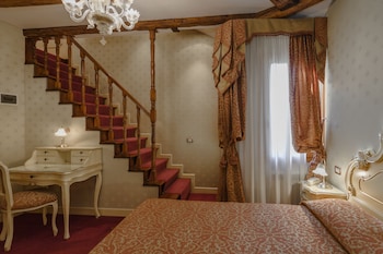A cozy bedroom with a wooden staircase leading up to a landing, a white desk with a lamp on the left, a bed with a patterned bedspread in the center, and a window with beige curtains on the right. The room has a warm color palette with beige walls and a red carpet. | Picture of Locanda al Leon 2 in Venice | 78c511690775d87886cc19b0a27492b4053ba429a8d9d7912a629bdfc102c7df | 001229736213 | 0 | 0 | 53 | 8 | 0 | 0 | |