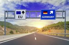 A highway signpost with two signs, one pointing to 'EU' with a blue background and a white arrow, and the other pointing to 'GERMANY' with a blue background and a white arrow. The signs are mounted on a metal frame above a road that stretches into the distance, flanked by a mountainous landscape and a clear sky with a few clouds. The sun is visible near the horizon, casting a warm glow over the scene. | Two options EU and Germany on road signs on highway Stock Photos | f867d35ddbd7d645ca7600c9f3342c4a5a61317cd8b79722dc480e9d6768dd32 | 001229736272 | 0 | 0 | 75 | 12 | 0 | 0 | |