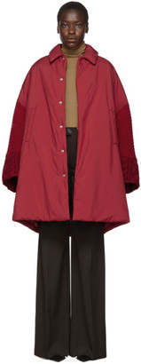 A person wearing a red jacket with a white collar, a beige sweater, and brown pants. | Undercover Red Cable Knit Sleeve Coat | 095e04064e33dfbab5530da6e0083f0a8cb0241093c657aa9577f59e60319b63 | 001229736288 | 0 | 0 | 16 | 6 | 0 | 0 | |