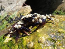 A crab with a black shell and white spots is perched on a rock covered in green moss and surrounded by various seashells. | Crab on a stone royalty free stock photos | 691deb636f334732f93d7782b5ddd9b6bc70c679a84b621352adc0f67423bd13 | 001229736301 | 0 | 0 | 23 | 8 | 0 | 0 | |