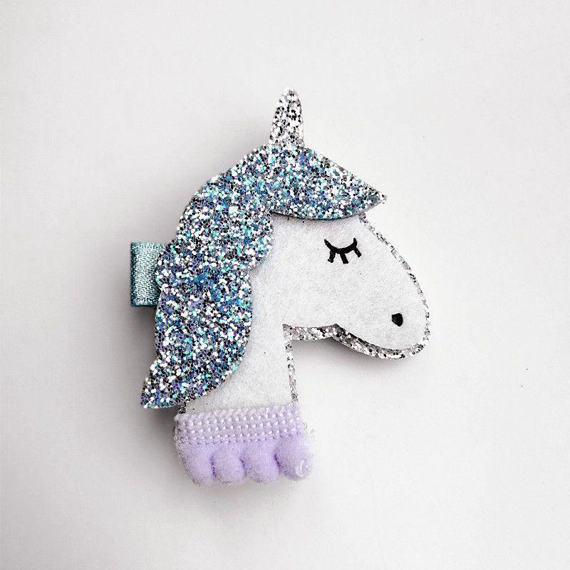 A small, white unicorn figurine with a sparkly blue mane and tail, and a purple and white striped hoof, is placed on a white background. The unicorn has a white body with a light blue mane and tail, and a small black nose. It has a pair of blue eyes and a small black eyelash on the right eye. | New Horse Colorful Kids Glitter Felt Hairpin Animals Girl Cute Pink Unicorn Hair Clip Hairpin Synthetic Leather Baby Clips | ea1d338375f92c5c23471ff09aa196e4c564c7a79d2166fc8f1aa6fa21c92322 | 001229736264 | 0 | 0 | 59 | 19 | 0 | 0 | |