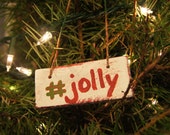 A close-up view of a Christmas tree branch with a white ornament that reads 'JOLLY' in red letters. The ornament is hanging from a string and is surrounded by green pine needles. The background is blurred, focusing the viewer's attention on the ornament. | Christmas ornament from reclaimed wood - #jolly | 899e0661628be439bd663d629ecffb8285bd4440327e1f9884491d315fec6163 | 001229736795 | 0 | 0 | 43 | 7 | 0 | 0 | |