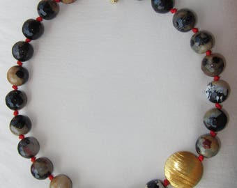 A close-up view of a necklace with a variety of beads, including black, white, and red beads, as well as a gold bead. The beads are arranged in a pattern with the gold bead in the center, surrounded by black and white beads. The background is a plain white surface. | Faceted Agate Choker | df5aaf2a9ccf4d780917a82ee7e4f1206ce5a3cbf6344c3e18b197a2656b7215 | 001229736778 | 0 | 0 | 50 | 3 | 0 | 0 | |
