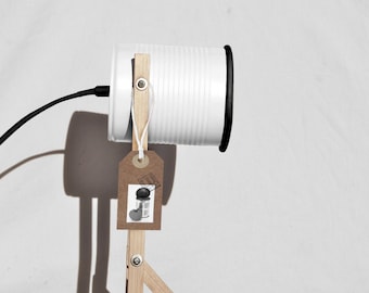 A white lamp with a wooden base and a white cord is turned on, casting a shadow on the wall behind it. The lamp has a white shade and a black base. | White & Black desk lamp.... eco friendly: recycled from tomato can ! UK or US or EURO plug. Led light bulb included. | 9b95fefb42b02583bdc2f5af3edec7d6da496d4fcae70ce9b5f213bab9184e55 | 001229736988 | 0 | 0 | 32 | 22 | 0 | 0 | |