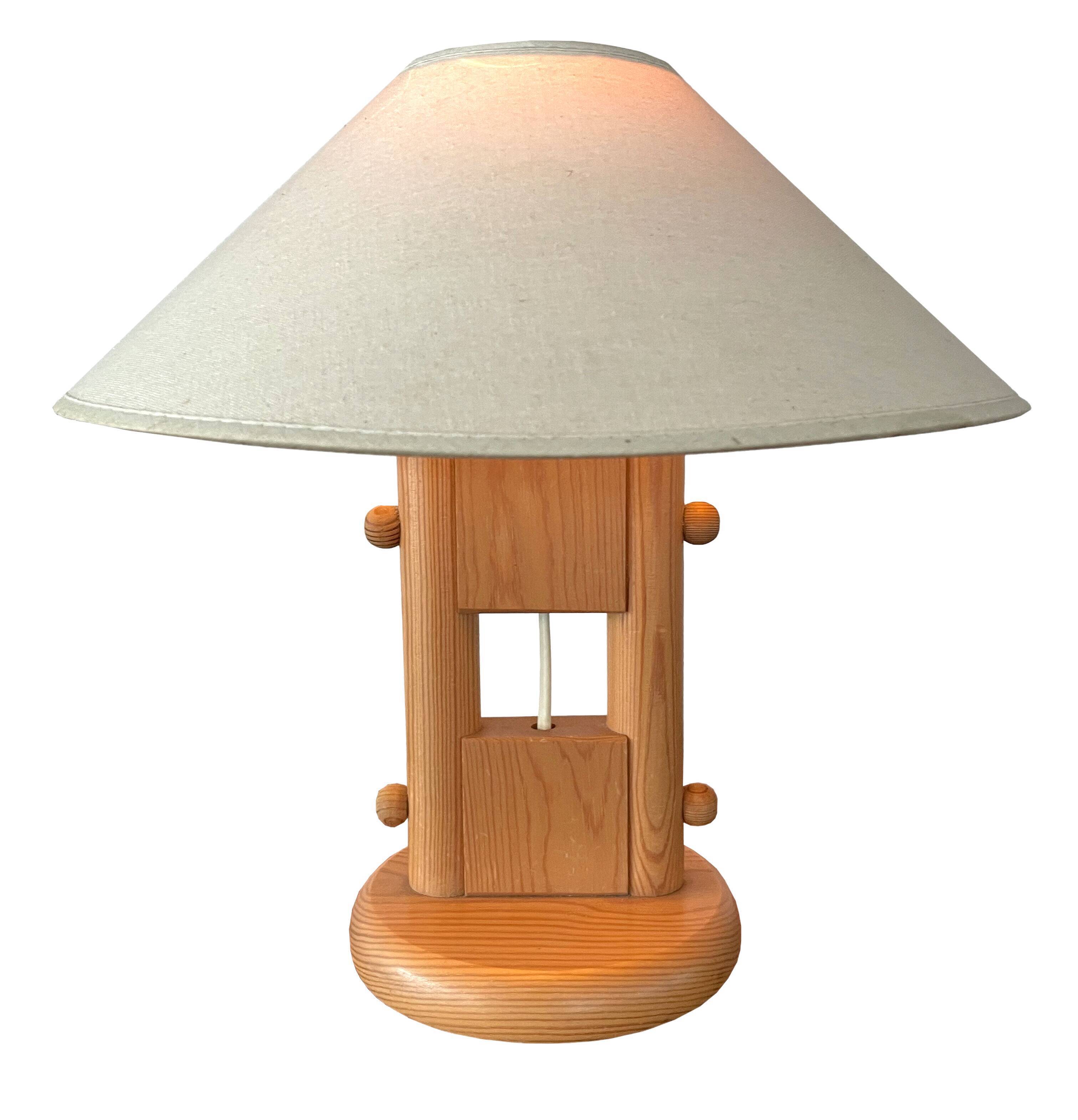 A wooden lamp with a beige lampshade is displayed against a white background. The lamp has a round base and a cylindrical wooden body with a small wooden shelf on the front. The lampshade is attached to the top of the lamp and has a soft glow emanating from within. | Vintage +LYS table lamp pine 1970s Danish Design | c75c537354837b24c279a5d9f3287c8fe86680af91420b1a838c0fd2ea482399 | 001229736819 | 0 | 0 | 50 | 8 | 0 | 0 | |