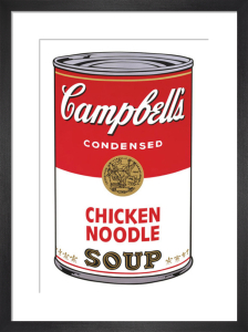 A framed image of a red can of Campbell's Chicken Noodle Soup with a gold emblem on the lid. The can is centered in the frame, and the word 'Soup' is written in white at the bottom of the can. The frame is black and has a simple design. | Campbell's Soup I, 1968 (chicken noodle) by Andy Warhol | 2003f9424a1b4dddee9a6f4b1ad2c17401d0221d115ef6f2e1496ac7b88563de | 001229736968 | 0 | 0 | 49 | 9 | 0 | 0 | |