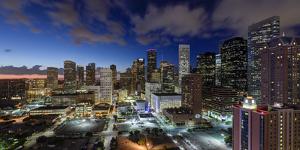 A panoramic view of a city skyline at dusk with a clear blue sky and scattered clouds. The city is illuminated with various lights, and the buildings are of different heights and architectural styles. The foreground shows a street with cars and buildings, and the overall scene conveys a sense of urban life. | Downtown City Skyline, Houston, Texas, Usa by Gavin Hellier | 385e262649db271a0c65a317cc171e6e9d7e45d1d9e6b7c3e1488706856300c0 | 001229736912 | 0 | 0 | 53 | 9 | 0 | 0 | |