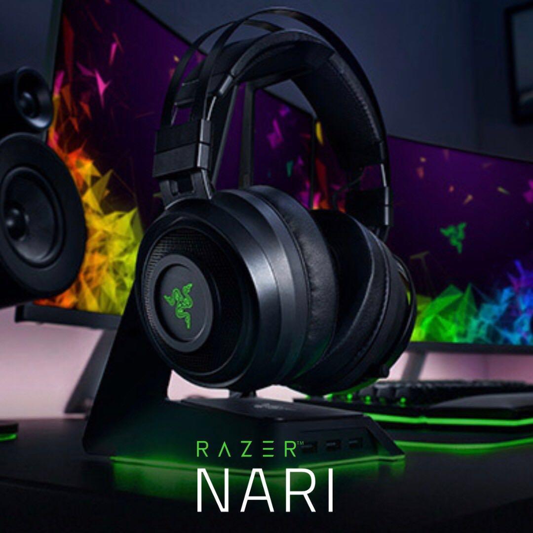 A pair of black and green gaming headphones with a Razer logo on the earcup is placed on a desk with a keyboard and mouse in front of a computer monitor displaying a colorful abstract wallpaper. | Razer Nari - Wireless Gaming Headset Headphone, Electronics | 96f64a4f49453ca67168aa5401d7e017a495759db9c26701bea514af90e15f3b | 001229736953 | 0 | 0 | 36 | 8 | 0 | 0 | |