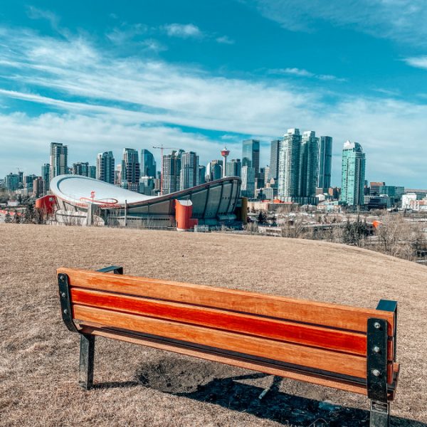 A wooden bench with a red seat and black metal legs is situated on a grassy field with a clear view of a city skyline in the background. The sky is blue with some clouds, and the cityscape includes tall buildings and a distinctive white dome structure. | Calgary one of the best places to live in Alberta | 09919c6207f1b0683613d7e3986c0ceec0b33ee21837920afd1d4f63c4ea4c17 | 001229736981 | 0 | 0 | 47 | 10 | 0 | 0 | |
