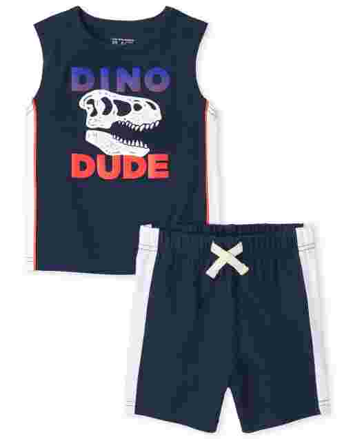 A child's outfit consisting of a short-sleeved, graphic t-shirt with a dinosaur design and the word 'DINO' in red, and navy blue shorts with a white cross-stitch design on the waistband. | Baby And Toddler Boys PLACE Sport Sleeveless Tank Top And Side Stripe Knit Shorts 2-Piece Set | c677ef8c2fd52c09cff4cdf79b381749cb05fbb17172ace8991d3ecf1759d8fb | 001229737469 | 0 | 0 | 31 | 16 | 0 | 0 | |