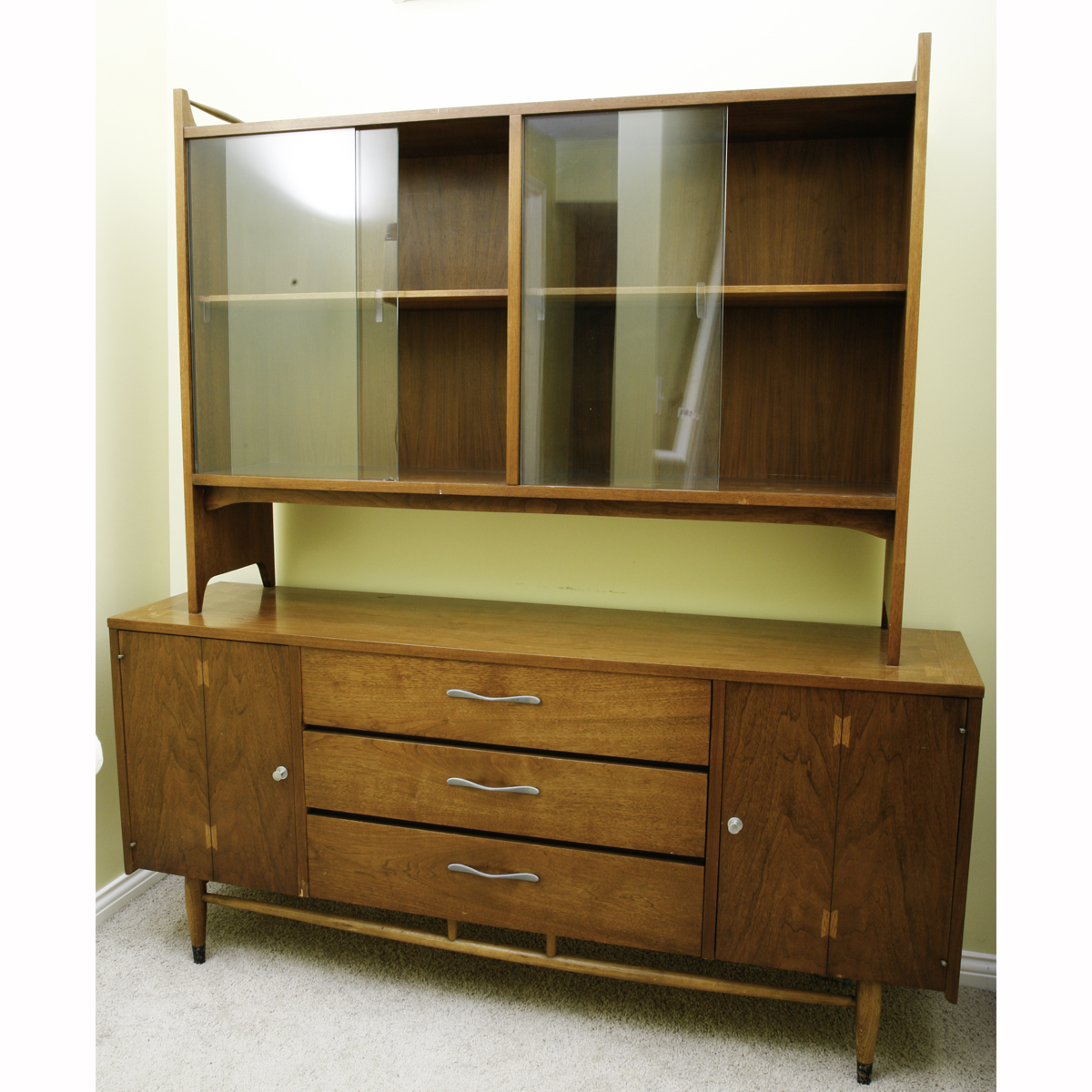A wooden cabinet with glass doors and a wooden top is placed against a yellow wall. The cabinet has three drawers with metal handles and is positioned on a beige carpet. | Mid Century Modern Lane Acclaim Two Piece China Cabinet ... | b132ea91b47468cbc756d5c55cdcbf1372b39527d1482f8d865416292b77ffb9 | 001229737463 | 0 | 0 | 31 | 10 | 0 | 0 | |