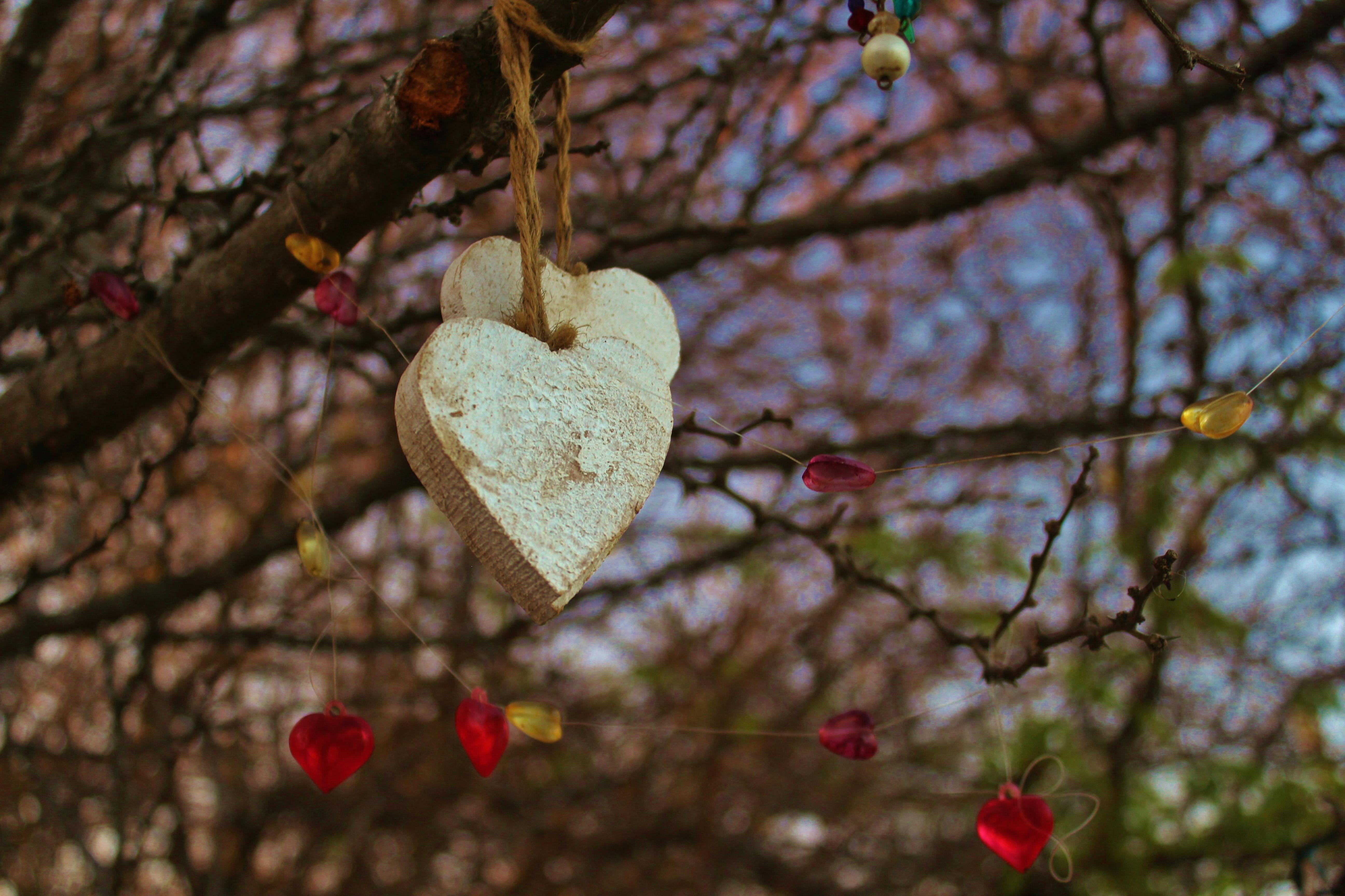 A heart-shaped decoration hangs from a tree branch, surrounded by bare branches and a few red leaves. The heart is made of a beige material and has a string tied to it. Below the heart, there are several red and yellow heart-shaped ornaments hanging from the branch. | Free stock photo of hearts, sweethearts, Wooden hearts | 9f61f0721175138f56bedd0f509d28185978c6141d7bd181f6018ab72fd1038e | 001229737319 | 0 | 0 | 47 | 8 | 0 | 0 | |
