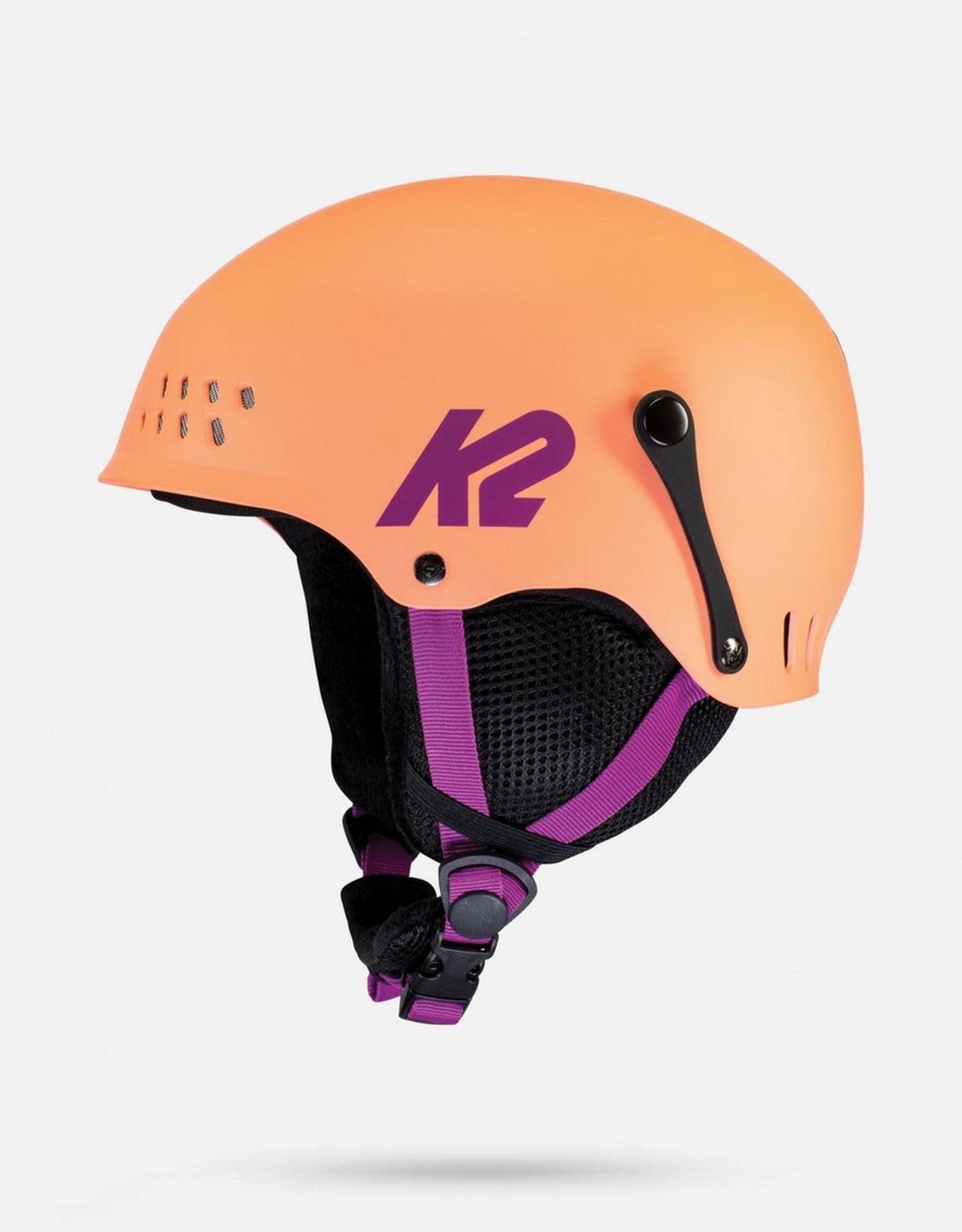 A close-up view of a bright orange helmet with a purple and black chin strap. The helmet has a large 'K2' logo in purple on the front. The background is a plain white color. | K2 K2 ENTITY Kids Helmet (21/22) | 70ef4ac306d653a2c6dcc309db73018109aa07835638826f76946dc91ea43adc | 001229738288 | 0 | 0 | 34 | 6 | 0 | 0 | |