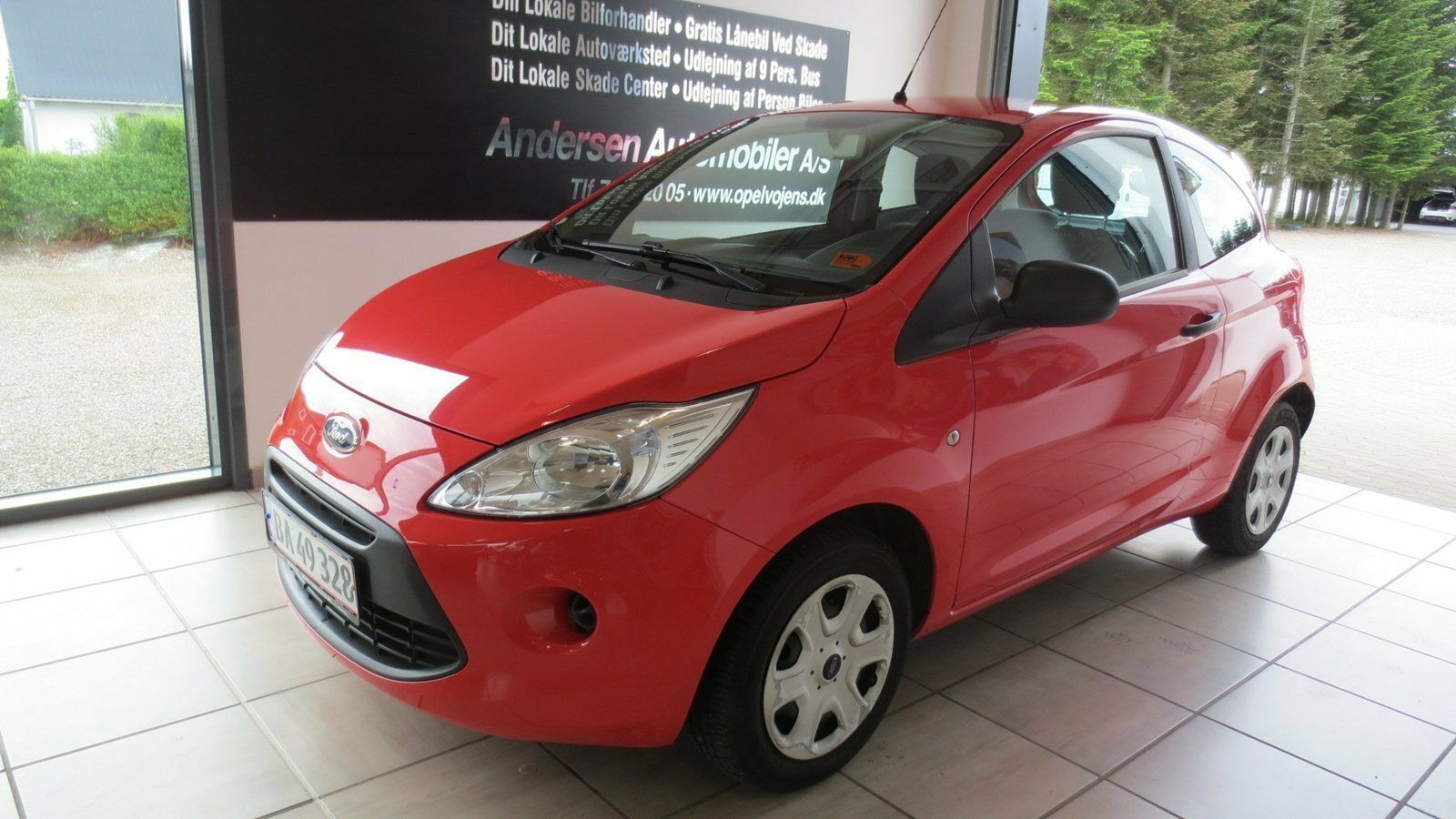 A red compact car is parked inside a showroom with a white tiled floor. The car has a small body with a sloping roof, a black windshield, and a black front grille. The showroom has a large window on the left side, and there is a sign on the wall behind the car with text that reads 'ANDERSEN AMBULANCE'. | Ford Ka Trend 1,2 | 198b0d06634efd028481ecde28b14162b09b5adfb64a875be36131988a1e1178 | 001229739046 | 0 | 0 | 59 | 4 | 0 | 0 | |