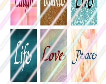 The second image shows a collection of six different backgrounds, each with a word written in a decorative font. The backgrounds are arranged in two rows of three, with the top row featuring the words 'ELO', 'DANCE', and 'LOVE', and the bottom row featuring the words 'LIFE', 'LOVE', and 'PEACE'. Each background has a unique design, with the top row having a gradient effect and the bottom row having a more solid appearance. The word 'LOVE' is repeated in both the top and bottom rows. | Sayings 1" x 2" Domino Images 4x6 Digital Collage Sheet Instant Download | a78b6ecbfa434ba15c0f7ec67af44ec53828a76d59d4de0c191c303c57d2dc6a | 001229739074 | 0 | 0 | 85 | 12 | 0 | 0 | |