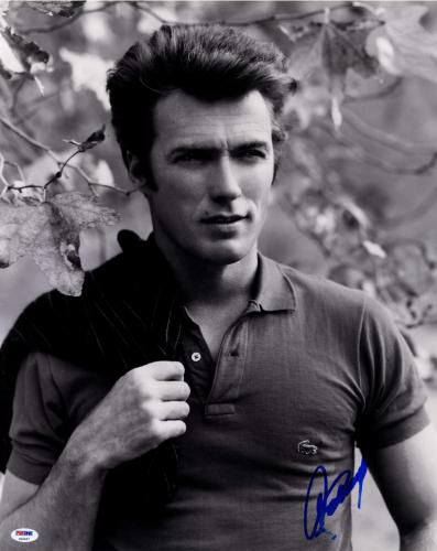 A black and white photograph of a man with a mustache and a neatly combed hairstyle, wearing a red polo shirt and holding a jacket over his shoulder. The man is standing in front of a tree with green leaves. | Clint Eastwood Autographed 16x20 B/W Photo AFTAL UACC RD COA PSA Letter | e71a11d1752d0d32722bcd40f4bb4a5adb245f683fb84babf8dcf7f944d6b717 | 001229739375 | 0 | 0 | 40 | 12 | 0 | 0 | |