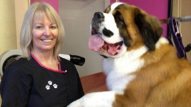 A woman in a pink shirt and black pants is standing next to a large Saint Bernard dog. The dog is wearing a purple leash and has a pink collar. The woman is smiling and looking at the camera, while the dog is looking at her with its tongue out. | Glynis Stewart, from Trendy Pooches Dog Grooming Salon and St Bernard dog Boodles | 3a956f0d9e056198099d20543b131cef17309f2d0343f6dfef5ce87408f48705 | 001229739353 | 0 | 0 | 50 | 13 | 0 | 0 | |
