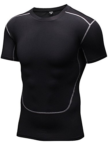A black t-shirt with a ribbed collar and a graphic design on the front is displayed against a white background. The t-shirt has a fitted silhouette with a pronounced chest area and a slightly curved neckline. The graphic design features a pattern of horizontal lines and a circular element at the bottom. The t-shirt is unbuttoned, revealing the interior of the collar and the tag. | Lavento Men's Cool Dry Compression Shirts Crewneck Short sleeve Workout T Shirts | 2d3027aafeffbd0eb563ff8aabecfd6bab237ad2d951840feede7da6b43b83ca | 001229739315 | 0 | 0 | 65 | 12 | 0 | 0 | |