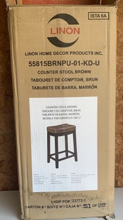 A cardboard box with a label that reads 'LINON HOME DECOR PRODUCTS INC.' and 'COUNTER STOOL BROWN' is sitting on a wooden floor. The box is closed and appears to be new, with no visible damage or wear. | BRAND NEW LEATHER BARSTOOL Thumbnail | 17406de4efa4e75c891dbf6a18119eb107f16b6c8f454bbb631ca072f5d52f0e | 001229739318 | 0 | 0 | 38 | 5 | 0 | 0 | |