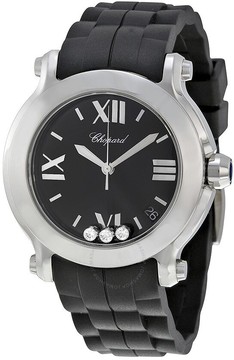 A black wristwatch with a silver case and black strap is displayed against a white background. The watch face shows a black dial with white Roman numerals, a date display at the 3 o'clock position, and three sub-dials. The hands of the watch are black, and the watch is set to approximately 10:10. The brand name 'CHIAPPA' is visible on the watch face. | Chopard Happy Sport Round Ladies Watch | af96e43af19f019da10b4cd1c92a241ab3296b02ba5032a9b2f7a32356775ef0 | 001229739339 | 0 | 0 | 63 | 6 | 0 | 0 | |