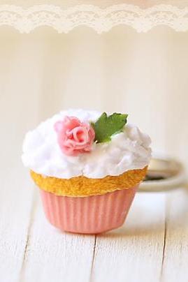 A small, pink cupcake with a dollop of white frosting on top, adorned with a pink rose and a green leaf, sits on a white surface with a lace border. | Miniature Food Jewelry - Cupcake Ring - Medium Pink Rose Cupcake Ring | 373d341e51d71d956687c97961fe59b1191aa6d40ac79b3558a5c1e94af3b903 | 001229739929 | 0 | 0 | 30 | 12 | 0 | 0 | |