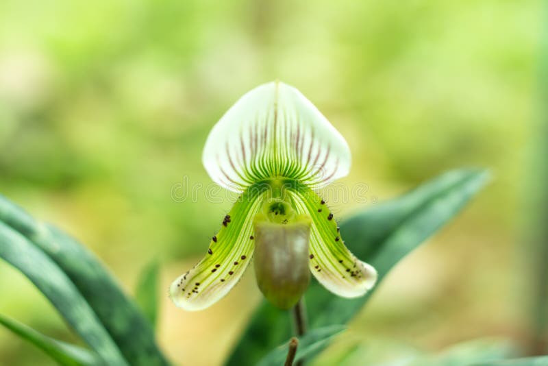 A close-up image of a delicate orchid with a white and green patterned petal, featuring a prominent yellow and green center. The orchid is set against a blurred green background, suggesting a natural environment. | Paphiopedilum callosum stock photos | 3e050666185c14819c570901640429e8e254efacf4446bfbb3c5db9053bf4873 | 001229739904 | 0 | 0 | 34 | 4 | 0 | 0 | |