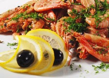A plate of seafood, including shrimp and possibly other types of seafood, is served with a lemon wedge and a black olive on the side. The seafood is garnished with parsley and is presented on a white plate. | Appetizer - Shrimp Plate Royalty Free Stock Photography | e81d9c48ed4dc611cf6f344e472fe1a56d4f1c5a8dd66e7a7d67e8f5ef9bed33 | 001229739879 | 0 | 0 | 38 | 8 | 0 | 0 | |