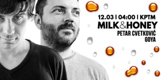 The second image is a promotional poster for a music event featuring two men with beards. The man on the left has a beard and is wearing a black shirt, while the man on the right has a beard and is wearing a gray shirt. The poster has a dark background with a gradient of orange and yellow hues, and there are various orange and yellow shapes and bubbles scattered throughout the image. The text 'MILK & HONEY' is prominently displayed at the top, along with the date '12/03/04' and the time '20:00'. Below the text, there is a smaller text 'KPTM | Milk & Honey Petar Cvetkovic Goya KPTM | fb0548332877f413627e3ff1e4b47d30d521a22ce01ca0e82406402c1f4301bf | 001229740296 | 0 | 0 | 102 | 7 | 0 | 0 | |