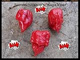 A collection of three red chili peppers are arranged on a wooden surface. Each pepper has a unique shape and size, with one being larger and more elongated, another being smaller and more rounded, and the third being the smallest and most irregularly shaped. The peppers are accompanied by three cartoonish red chili pepper illustrations, each with a different expression, placed around the peppers. The image is captioned 'Samenchill's Nagaviper' at the top. | Naga Viper 10 Seeds -Ultra Hot- 1.4 Mi. Scoville Sell By Samenchilishop(world) | b82a1662d7020d1b67b6bcc52cfd1cb5fc7e4522bebc00b87b88bfc27ed990b4 | 001229740434 | 0 | 0 | 73 | 12 | 0 | 0 | |