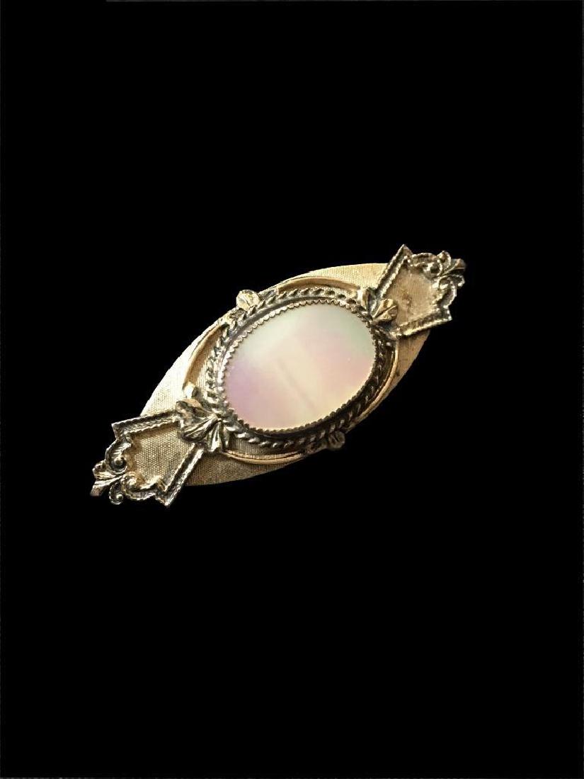A close-up of a vintage brooch with a circular frame and a pearl-like gemstone in the center, set against a dark background. | Mid 20thc Mother Of Pearl Brooch | 0e11f3e487eb8e9e5d2c78ab8802c7954fc0faa4d467d46a9fdb7163b62105d4 | 001229740347 | 0 | 0 | 22 | 6 | 0 | 0 | |