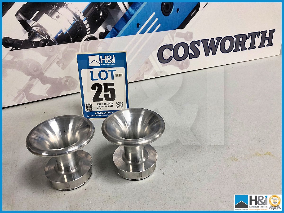Two shiny, new-looking metal wrenches are placed on a white surface with a 'LOT 25' sticker and a 'COSWORTH' box in the background. | Lot 25 - 9 x Cosworth Lotus GLC GT2 trumpet air restrictor. Code: 20024592. Lot 233 | cf3c2067c34d3782b77bd4df5b480bd59c01ff73319c4e828026572620a3b83f | 001229740507 | 0 | 0 | 23 | 16 | 0 | 0 | |