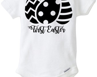 A white onesie with a black spider design on the front. The spider has eight legs and three black dots on its body. Below the spider, there is a black cursive phrase that reads 'FIRST EASTER'. The onesie has a ribbed neckline and cuffs at the wrists and ankles. | First Easter Baby Onesie | 11ff28d73e2c804816811db9597e147fe59b7419e08dfcb6265601f3e9f88cfb | 001229740104 | 0 | 0 | 49 | 4 | 0 | 0 | |