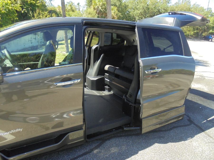 A silver minivan is parked on the side of the road with its rear passenger door open, revealing the interior. The van is positioned on a street with a sidewalk on the left side. There is a person standing on the sidewalk, partially visible, and another person is visible in the background further away. The van's interior shows a black seat with a cup holder and a storage compartment. The van's exterior features a 'Hyundai' logo on the lower left side. | Gray Honda Odyssey image number 13 | 45139929e2e2102ac168e608a40fb9311265138c887b503b11438518b622ac31 | 001229740483 | 0 | 0 | 81 | 6 | 0 | 0 | |
