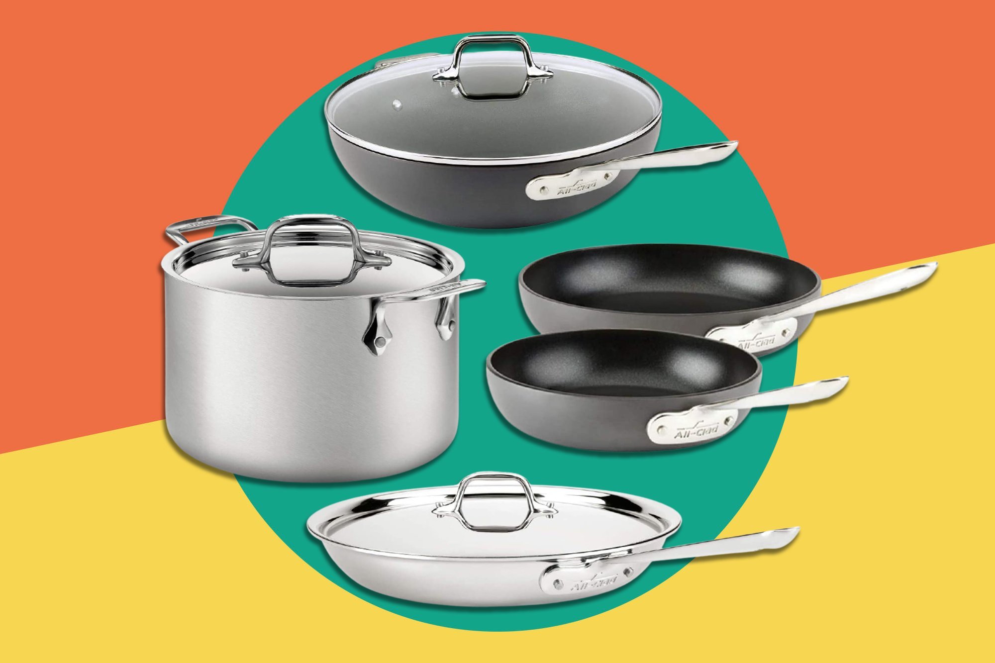 A set of stainless steel pots and pans is displayed on a colorful background. The set includes a large pot with a lid, a smaller pot with a lid, a frying pan, and a saucepan. Each item has a handle and is placed on a green and yellow striped background. | Amazon Has Slashed Tons of Prices on All-Clad Cookware for Prime Day-Including a Saucepan for $115 Less | 7407b6db5072bceb0c6645bfaed0e57ed0f2d81fc45cda1ad97403a4e7bedf40 | 001229741043 | 0 | 0 | 50 | 17 | 0 | 0 | |